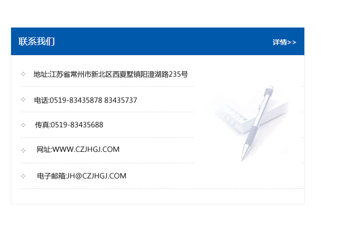 地址:常州市新北區友邦商務大廈1幢16、17層  電話:0519-85101652  傳真:0519-85112595  郵編:213022  網址:www.cz-jiayue_cn.lnssnt.com  郵箱:xiajifengaa@163.com